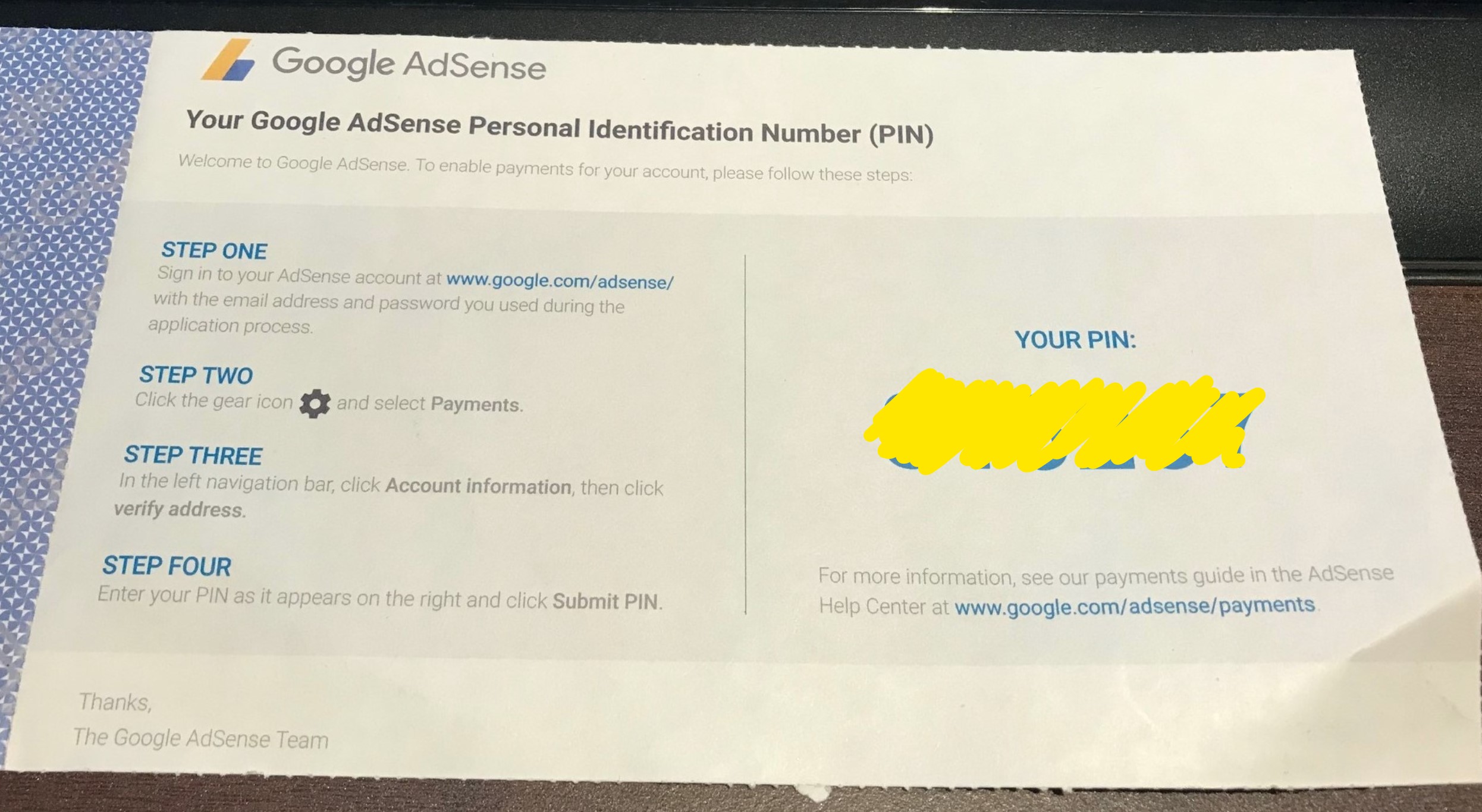 그리하여 구글로부터 수익 10불이 넘어간다면 받을 수 있다는 PIN 번호도 받아볼 수 있었다.