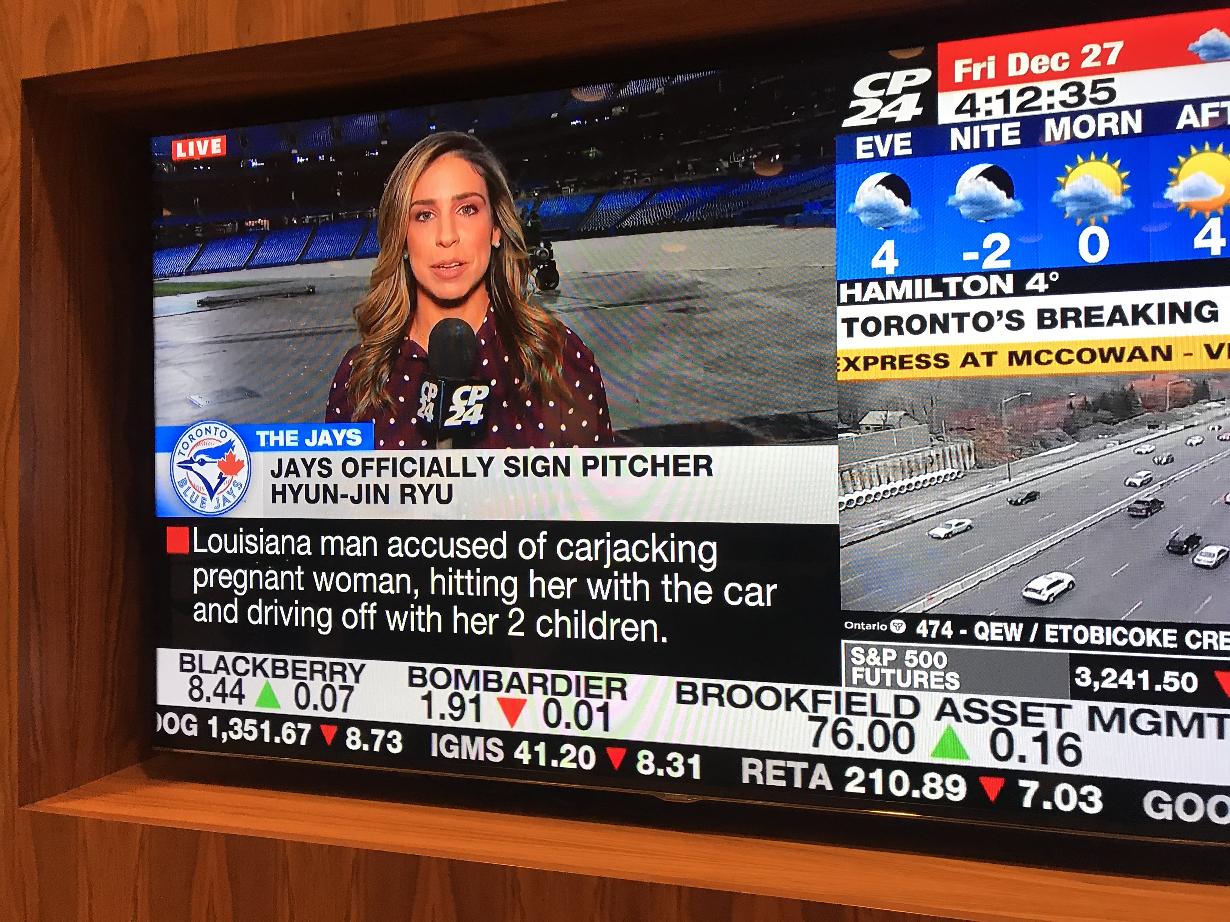 마침 류현진이 블루제이스 입단식을 한 2019년 12월 27일 우리 가족은 토론토에 있었다. 가족들과 시간을 보내다가 우연히 호텔 로비에 있는 TV를 보았는데 현지 언론에서도 관심이 있는지 곧 입단식을 할 것이라는 뉴스가 나왔다. 내가 묵는 호텔에서 블루제이스의 홈 경기장인 로저스센터까지는 겨우 30분 정도 거리니 당장이라도 가보고 싶었지만 간다고 볼 수 있는 것도 아닐 테니 뭐...