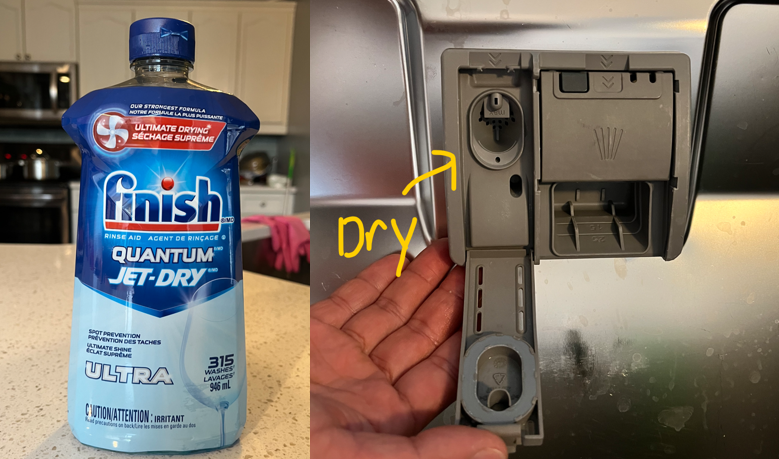 식기 세척기 관련해서 한 가지 더 핫한 아이템이 있다. 그것은 바로 식기 세척제 용 건조제이다. 이것의 원리는 표면장력을 낮춰서 물방울들이 컵이나 접시에서 잘 떨어지게 하는 것이다. 애초 컵이나 접시에서 물기가 빨리 떨어지니 빨리 건조가 되는 것이다. 아래 사진과 같이 식기 세척기에 건조제를 넣는 구멍이 있다면 사용이 가능하다. 한국에서는 구하기 어려운 제품으로 보이니 식기 세척기 애용가들에게 선물하기에 아주 좋은 아이템이 아닐까 (혼자서) 생각한다. 월마트, 코스트코에서 구입이 가능하나, 코스트코에서 세일할 때 사는 것이 가장 저렴하다.